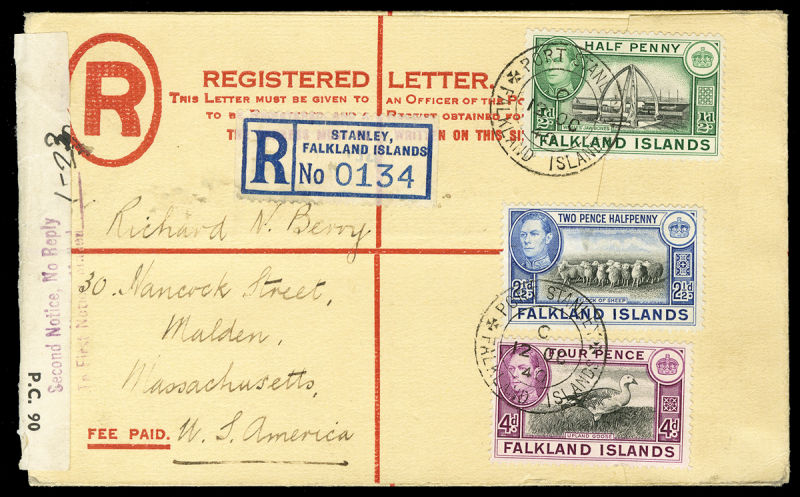 COMMONWEALTH FALKLAND ISLANDS 1940 (12 Oct) registered envelope (size G) addressed to USA, franked with 1/2p, 2 1/2p and 4p George VI, tied by Port Stanley departure cds, with corresponding Registry label alongside, large "PC 90 Opened by Examiner