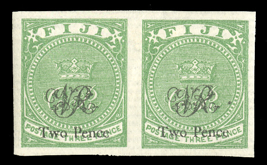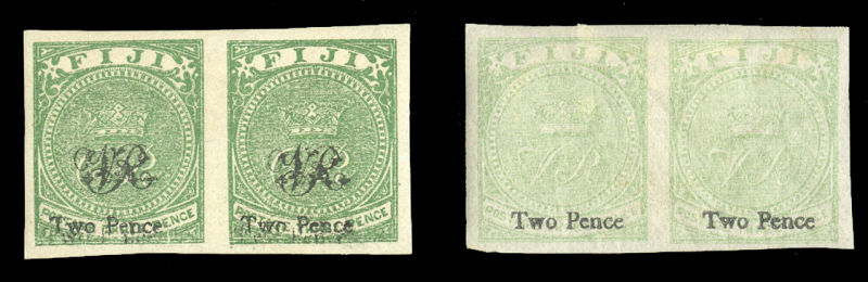 COMMONWEALTH FIJI (34var) 1876 2p on 3p deep green, 2p on 2p pale green, imperforate horizontal pairs on wove paper, the former with "Two Pence" slightly doubled, the latter with "VR" omitted, h.r., fine-v.f. (SG 29,29a var) (Image)