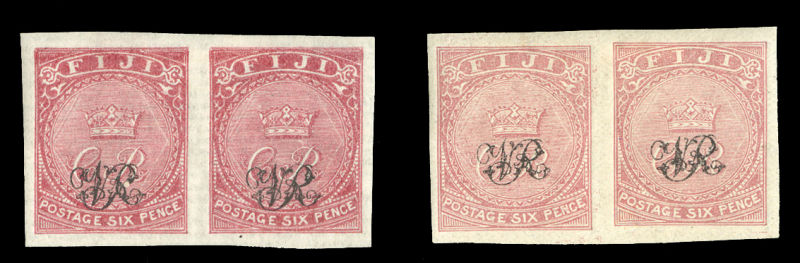 COMMONWEALTH FIJI (37var) 1876 6d carmine rose on laid paper and 6d rose on wove paper, imperforate horizontal pairs, h.r., fine (SG 33b,33var, £700+) (Image)