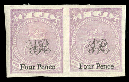COMMONWEALTH FIJI (38var) 1876 4p on 3p lilac on laid paper, imperforate horizontal pair, h.r., v.f. (SG 34a, £1,000) (Image)
