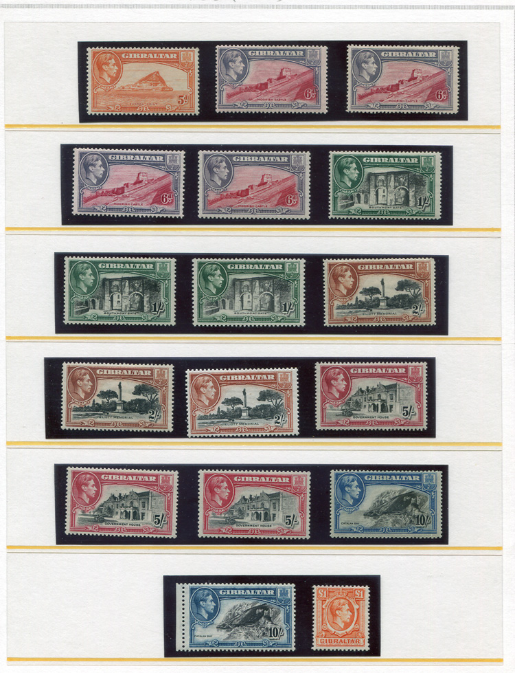 COMMONWEALTH GIBRALTAR 1938-51 George VI 1/2p-£1 complete, with all perforation and watermark varieties, 36 different, l.h. or n.h. (including high values), fine-v.f., difficult set to assemble (SG 121/131, £2,300) (Image)