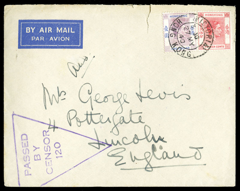 COMMONWEALTH HONG KONG 1940 (27 May) cover written from the British Military Hospital in Shanghai to England, franked with 15c and $1 George VI (SG 146,151), tied by Victoria departure cds, with triangular "Passed by Censor 120" hs on front and