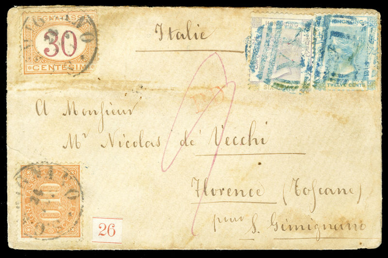 COMMONWEALTH British Post Offices in Japan 1871 (Oct. 7) cover from Yokoyama to Florence, sent via Hong Kong where 6c and 12c were applied, tied by "YI" obliterator postmarks, with 10c and 30c Italian Postage Dues applied on arrival, Yokohama