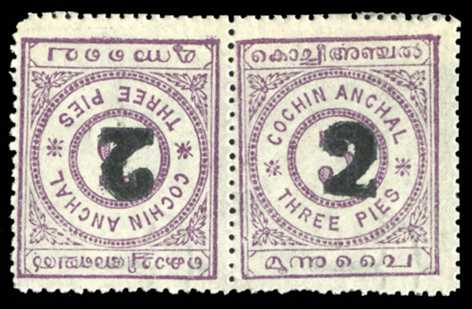 COMMONWEALTH INDIAN FEUDATORY STATES - Cochin (13c) 1909 2p on 3c red violet, horizontal tete-beche pair (stamps and surcharge), unused without gum, fine, signed Brun, cat. Value $650 (Image)