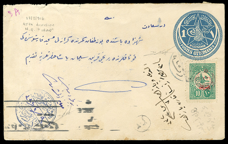 COMMONWEALTH IRAQ - Turkish Administration 1916 (22 Mar) Ottoman 1pi stationery entire envelope uprated with 10pa green, addressed to Istanbul, bearing departure markings of the 45th Division, H.Q. Iraq, censor cachet and arrival datestamp, backflap