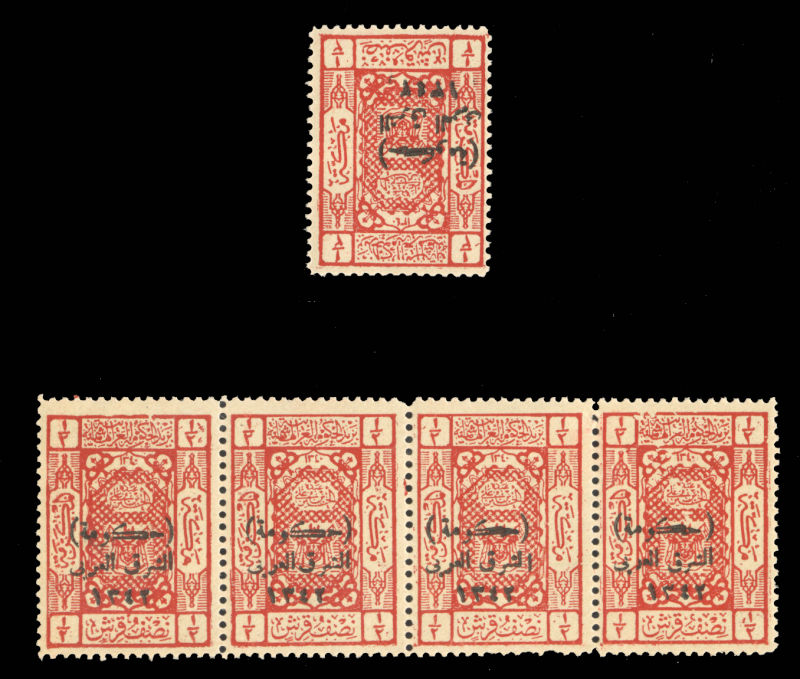 COMMONWEALTH JORDAN Officials (O1) 1924 1/2pi red, single and strip of four, l.h., strip is n.h. but with dried gum in places, fine-v.f., cat. Value $500 (Image)