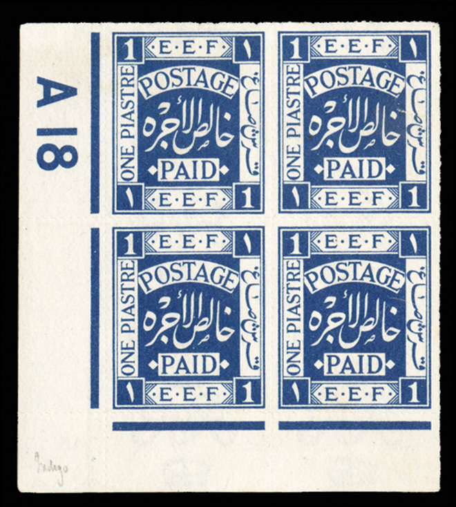 COMMONWEALTH PALESTINE (1) 1918 1pi deep blue, three different shades, including indigo and blue, bottom left sheet corner control number (A18) blocks of four, unused without gum as issued, two with hinge marks in margin or on stamps, v.f. (SG