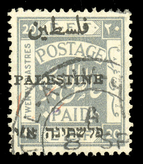 COMMONWEALTH PALESTINE (25d) 1921 20p gray, perf. 14, Type 6a, used, fine (SG 59, £2,500) cat. Value $2900 (Image)