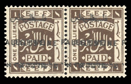 COMMONWEALTH PALESTINE (48b) 1922 1m dark brown, overprint double, horizontal pair, n.h., v.f. (catalogued as hinged) (SG 71c; £500+) (Image)