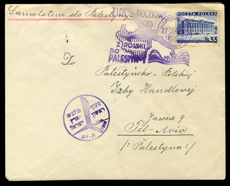 COMMONWEALTH PALESTINE Flight Covers 1936 (27 Oct) two first flights from Poland (one from Lwow, the other Warszawa) to Tel Aviv, each with appropriate departure pmk and cachet, fine-v.f. (Image)