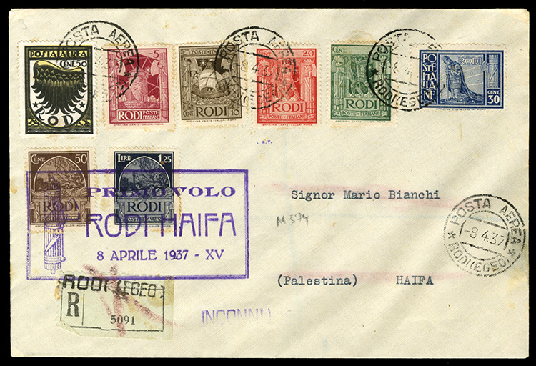 COMMONWEALTH PALESTINE Flight Covers 1937 (8 Apr) first flight cover, registered from Rhodes to Haifa, with special cachet and arrival pmk, handstamped "Inconnu" and sent back via Alexandria to sender (Image)