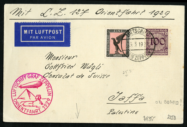 COMMONWEALTH PALESTINE Zeppelin Flights (Si.23 II a) 1929 Orient Flight from Friedrichshafen, "Er Ramle 26 March 1929" pmk struck on both sides, v.f. (Image)