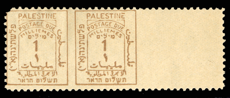 COMMONWEALTH PALESTINE Postage Dues (J1var) 1923 1m purple, horizontal pair imperf. between and at left, heavy h.r. at right, fine and scarce variety (SG D1b, £1,300)