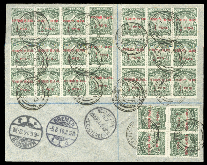 COMMONWEALTH PENHRYN ISLAND (SG 9,9a) 1914 registered cover to Germany, franked on both sides with 46x 1/2p green, carmine overprint, one with "missing dot" variety, Wellington transit and Bremen arrival pmks, fine-v.f. (Image) (Image 2)