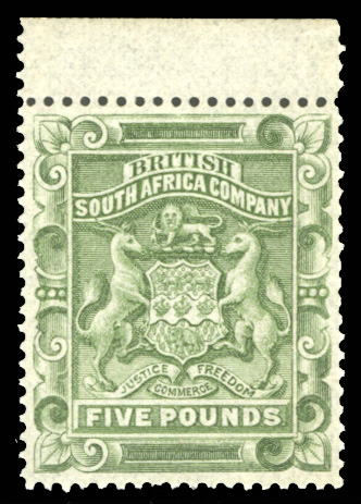 COMMONWEALTH RHODESIA (18) 1890 £5 yellow green, top sheet margin single, unused without gum, fresh, v.f. (SG 12) (Image)