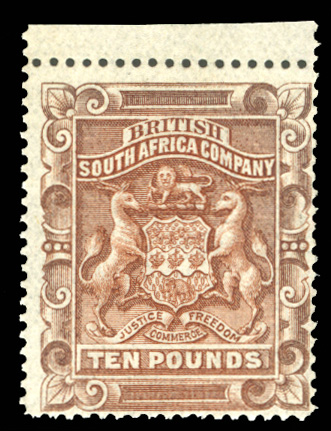 COMMONWEALTH RHODESIA (19) 1890 £10 orange brown, top sheet margin single, unused without gum, fresh, fine (SG 13) (Image)