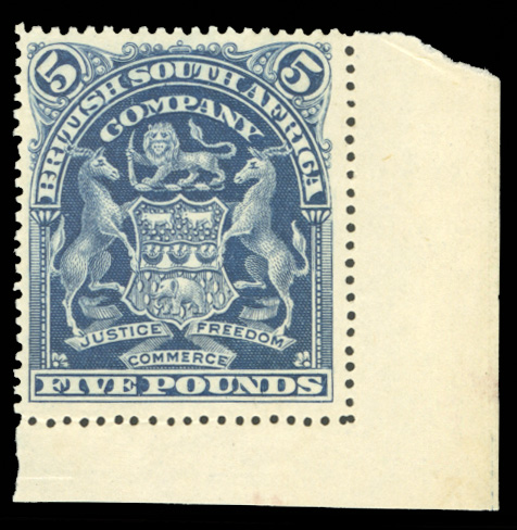 COMMONWEALTH RHODESIA (74) 1901 £5 dark blue, lower right sheet margin single, unused without gum, fresh, v.f. (SG 92) (Image)
