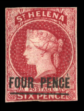 COMMONWEALTH ST. HELENA (10) 1863 4p on 6p carmine, small h.r., margins all around, tiny scissors cuts in margin at top and bottom, otherwise fresh and fine stamp, cat. Value $600 (Image)