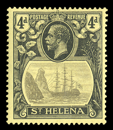 COMMONWEALTH ST. HELENA (95var) 1922 Badge of the Colony, 4p black & yellow, "Storm over rock" variety, h.r., fine (SG 92d, £500) (Image)