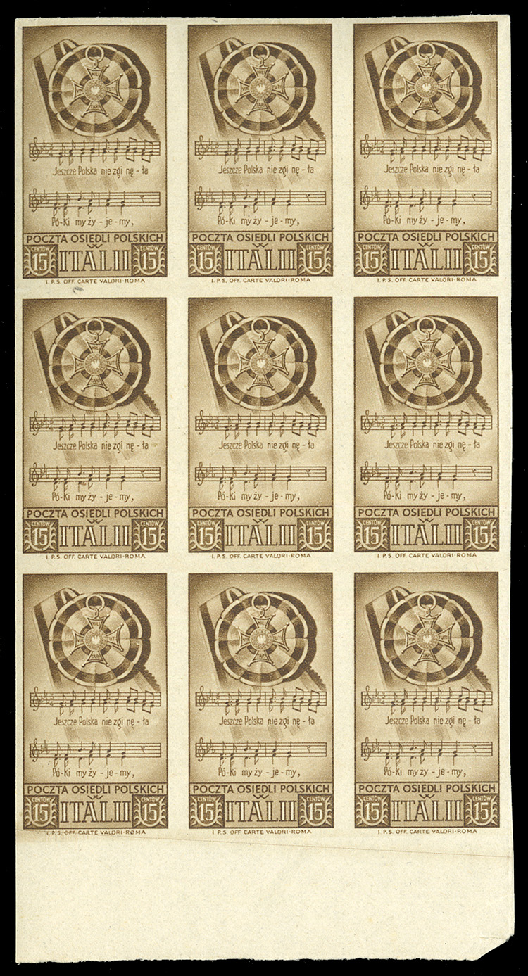 WORLD WAR II OCCUPATION ISSUES Polish Corps in Italy - Corpo Polacco (Sass.18a) 1946 National Anthem, 15c brown, imperforate bottom sheet margin block of nine, n.h., v.f. (Sass. Euro 2,520) (Image)