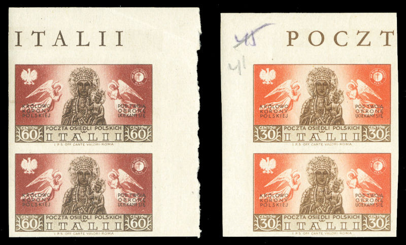 WORLD WAR II OCCUPATION ISSUES Polish Corps in Italy - Corpo Polacco (Sass.19A,21A) 1946 Madonna, 30gr orange & brown, 60gr brown & rose, imperforate sheet corner margin vertical pairs, n.h., v.f., extremely rare (Sass. Euro 24,000) (Image)