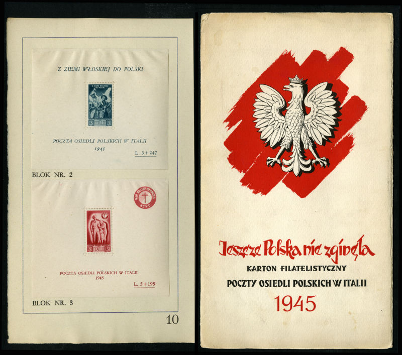 WORLD WAR II OCCUPATION ISSUES Polish Corps in Italy - Corpo Polacco 1946 special presentation folder with Polish Eagle and opening lines of the Polish National Anthem on front cover, with stamps and all three souvenir sheets inside adhered to ten