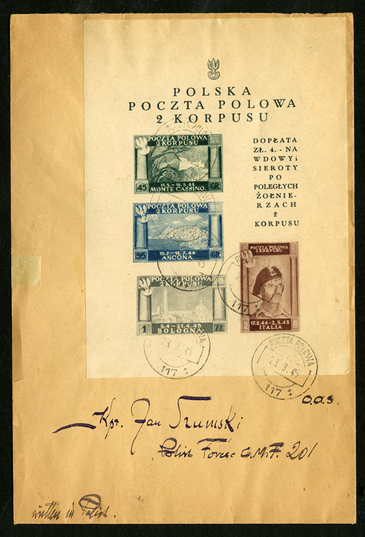 WORLD WAR II OCCUPATION ISSUES Polish Corps in Italy - Corpo Polacco (Sass.1) 1946 souvenir sheet of four canceled by 28.8.45 Poczta Polowa 117 cds on locally addressed cover, overall toning and small cover tears, otherwise fine (Image)