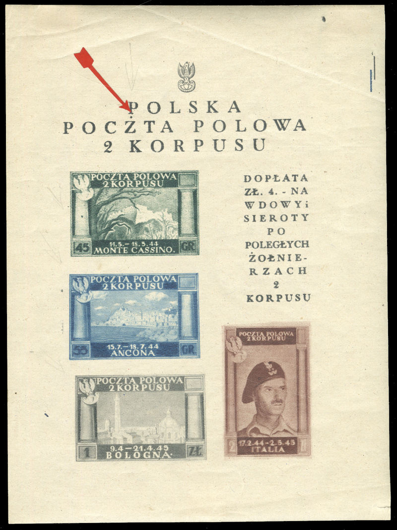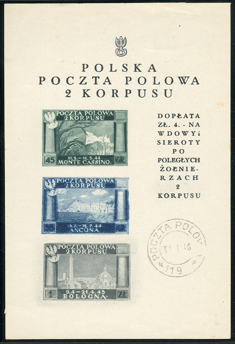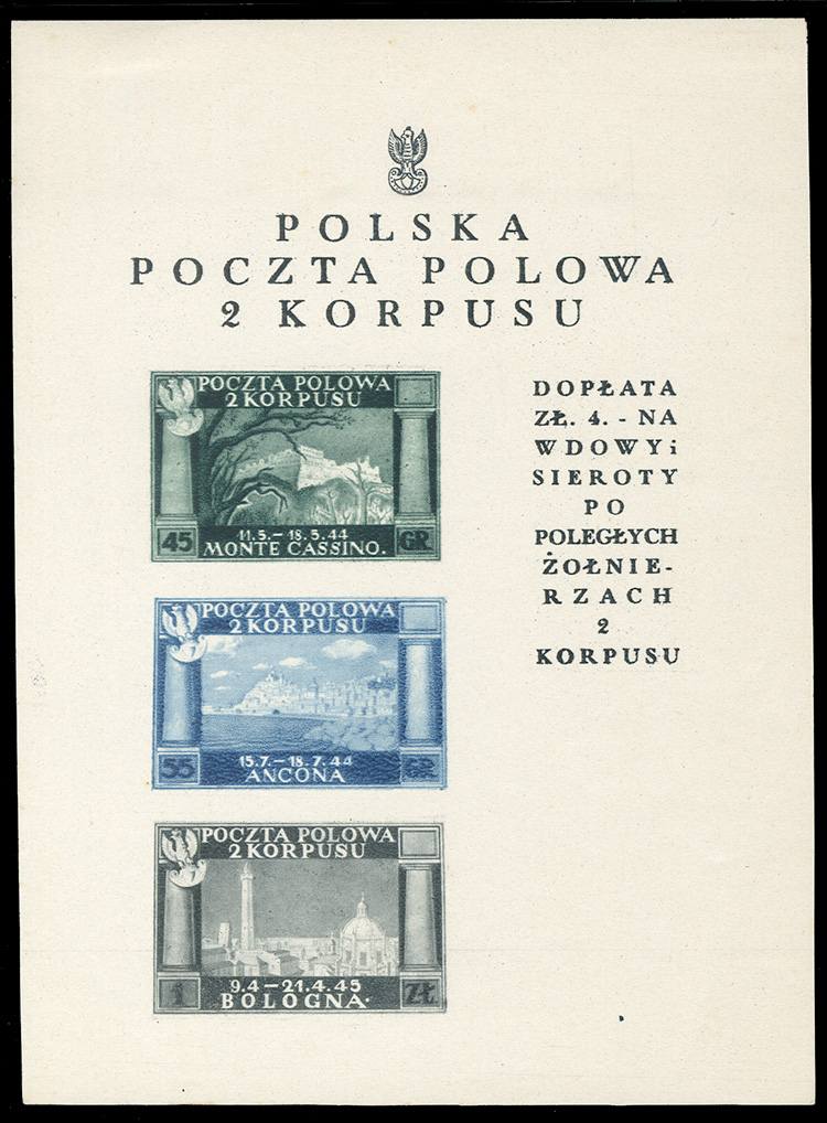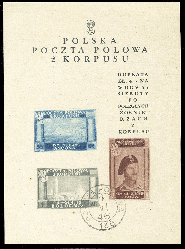 WORLD WAR II OCCUPATION ISSUES Polish Corps in Italy - Corpo Polacco (Sass.1Acf) 1946 souvenir sheet (white paper) of three, missing the 1zl value (General Anders), with "Poczta Polowa 119" pmk, v.f., stated to be the only known(!) (Euro 14,000) (Image)