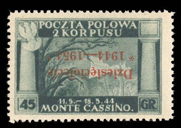 WORLD WAR II OCCUPATION ISSUES Polish Corps in Italy - Corpo Polacco (Sass.7a) 1954 45gr green, "Dziesieciolecie 1944-1954" red overprint inverted, n.h., v.f., signed (Euro 2,000) (Image)