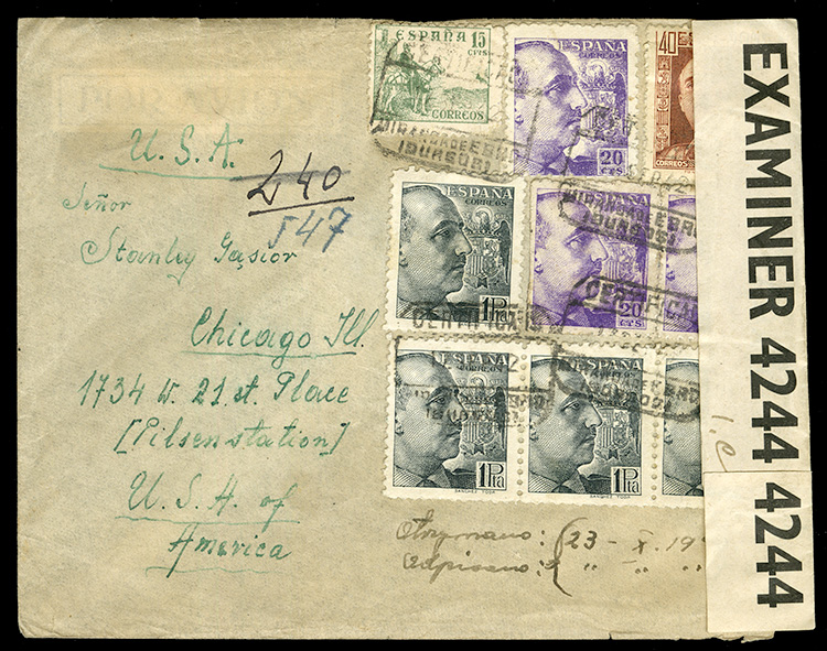 Internment of Polish Soldiers in Spain 1942 (19 Sep) cover to USA, sent by Albin Nowobilski "Campo de Concentrazione Mirande de Ebro", with Madrid departure datestamps, Opened by Examiner 4244 censor label at right, Chicago arrival (Oct 22, 1942) on