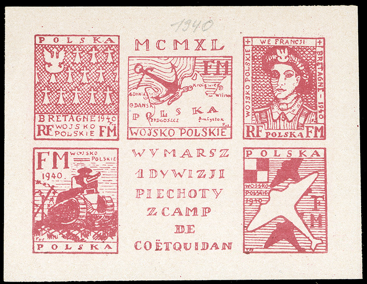 Polish Army in France 1940 Camp Coetquidan souvenir sheet of four, unused without gum as issued, v.f., rare (Image)