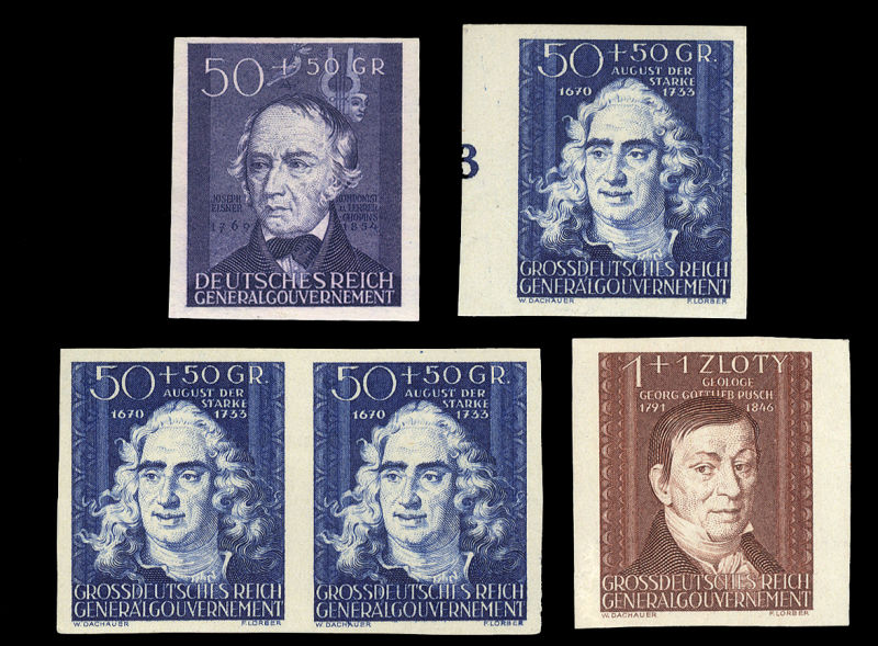 Generalgouvernement - WWII German Occupation (Mi.99,123,124U) 1942-44 three diff. imperforate singles, also 50+50gr ultramarine, imperf. horizontal pair, v.f.