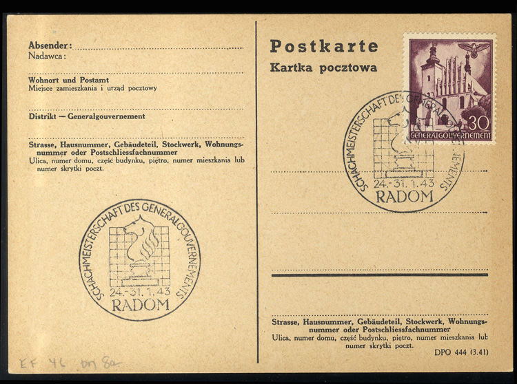 Generalgouvernement - WWII German Occupation 1943 Chess Tournament in Radom, six unaddressed postal cards, each with different franking, commemorative Chess Tournament 24-31.1.43 pmks, v.f. (Image)