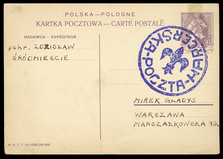 Warsaw Uprising 1944 (19 Aug) 25gr stationery card addressed to Mirek Giladys at Marszalkowska 92, bearing "Poczta Harcerska" Scout hs, fine (Image)