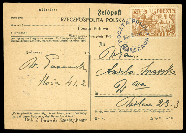 Warsaw Uprising 1944 (5 Sep) German Feldpost card overprinted "Rzeczpospolita Polska Poczta Polowa Warszawa Sierpien 1944", franked with Poczta Polowa AK light brown adhesive, tied by "Poczta Polowa Warszawa" 5-9-1944 cds, fine and rare usage (Image)