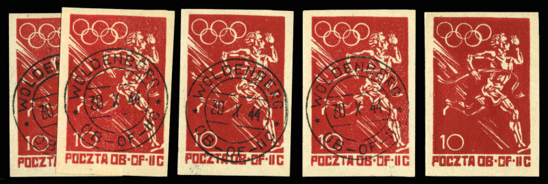 Woldenberg - Offlag IIC 1944 Olympics, 10f red, five singles, one unused, others canceled 30.X.44, v.f., signed Schmutz (Image)