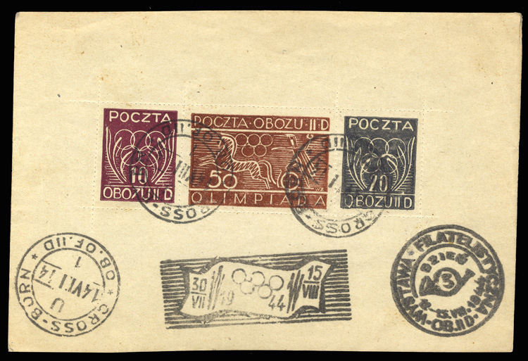 Gross-Born Offlag IID 1944 Olympics souvenir sheet of three, with three different cancellations, fine-v.f. (Image)
