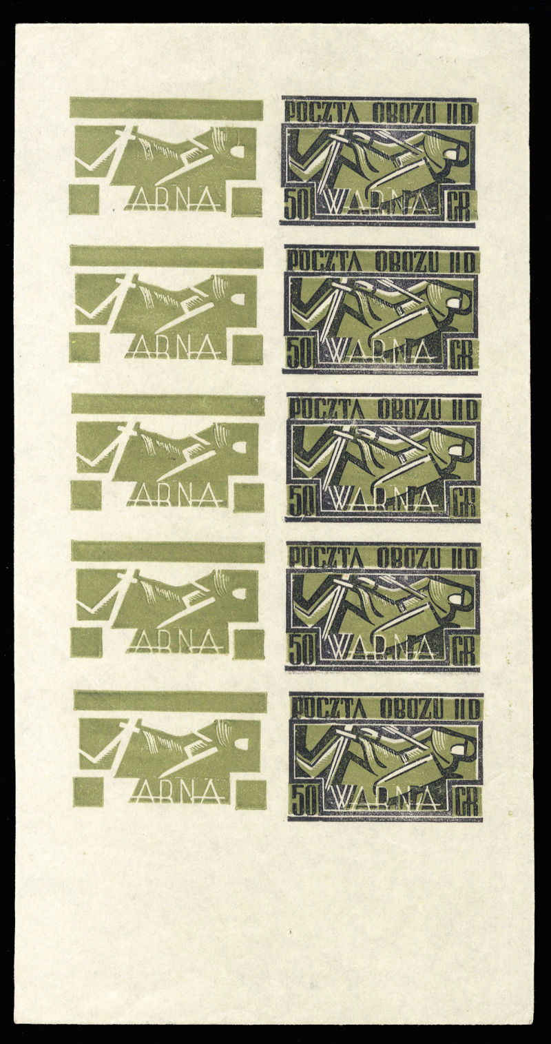 Gross-Born Offlag IID 1945 Warna, imperforate sheetlet of 10, black color omitted at left, unused without gum as issued, v.f., signed Lubinski, with 1984 Dr.Kronenberg certificate. A great POW rarity, only a few exist (Fischer Ivar) (Image)