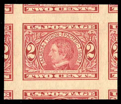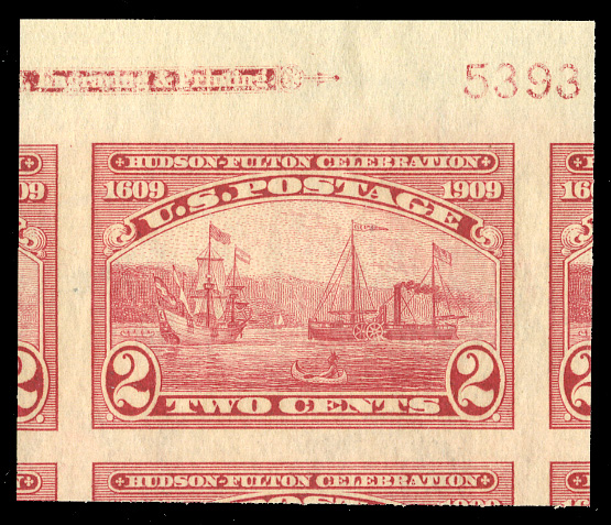 States 1909 Commemoratives (373) 1909 2c carmine, top margin single, n.h., margins all around with adjoining stamps on all sides, with 2024 PSE certificate graded "Gem 100" (SMQ $200) (Image)