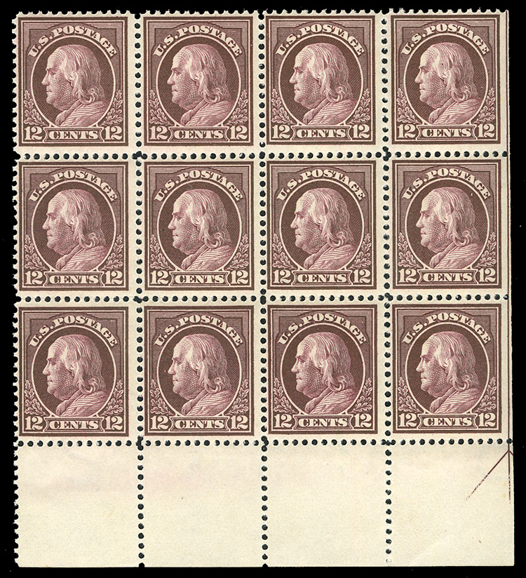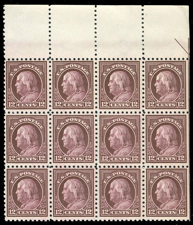 States 1914-17 Issues (435) 1914 12c claret brown, top margin block of 12, n.h., right strip of three straight edge, with Arrow, top left stamp with perf. disc adhesion, fine, with 2025 PFC, cat. Value $900 (Image)