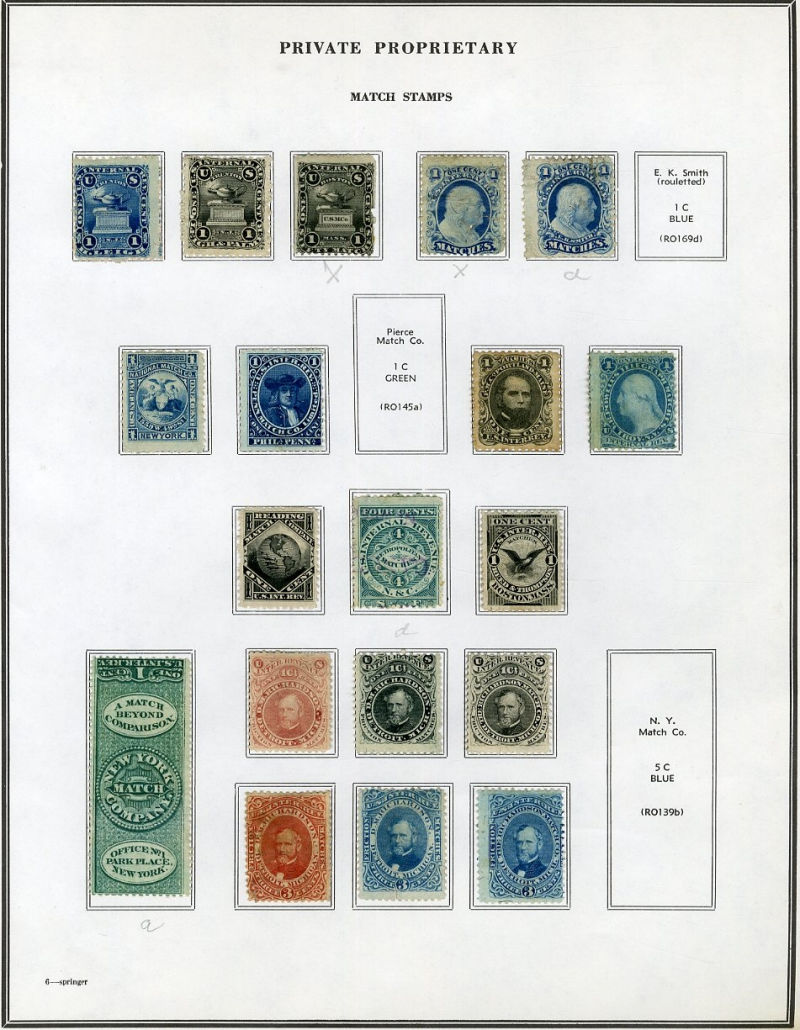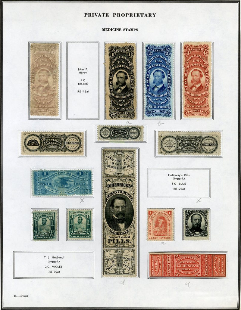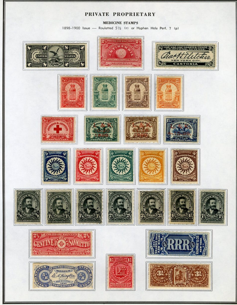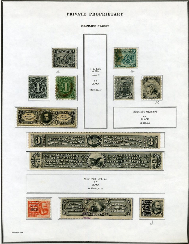 1327 O, og   imageLARGE LOTS AND COLLECTIONS UNITED STATES Private Die & Proprietary 1862-77 Match and Medicine, collection on Aldrich album pages, 550+ different, formed by an astute collector, used and unused, usual condition with faults noted, many interesting and rare items, fine-v.f., high catalogue value (Image)