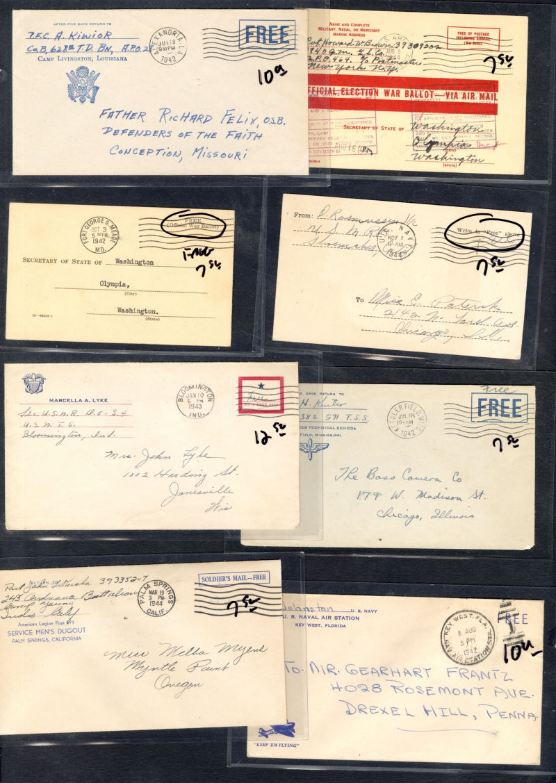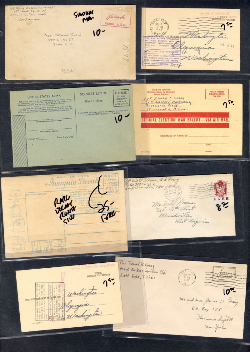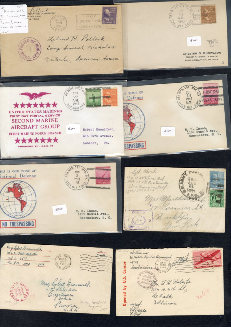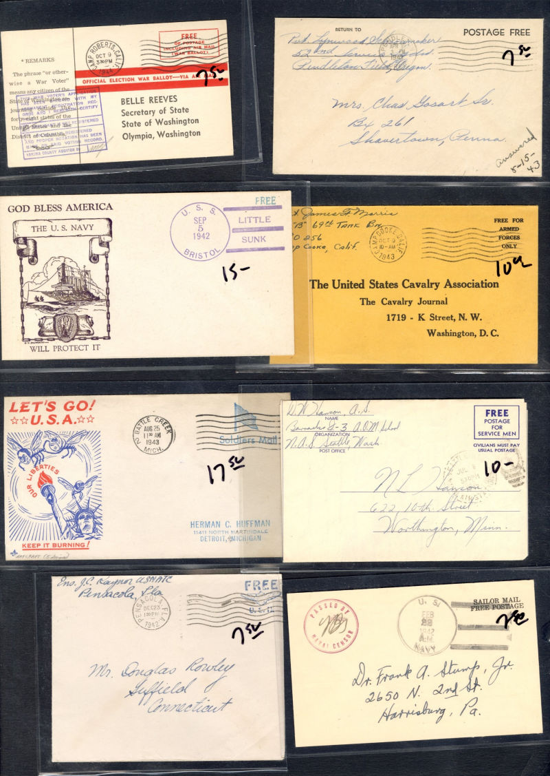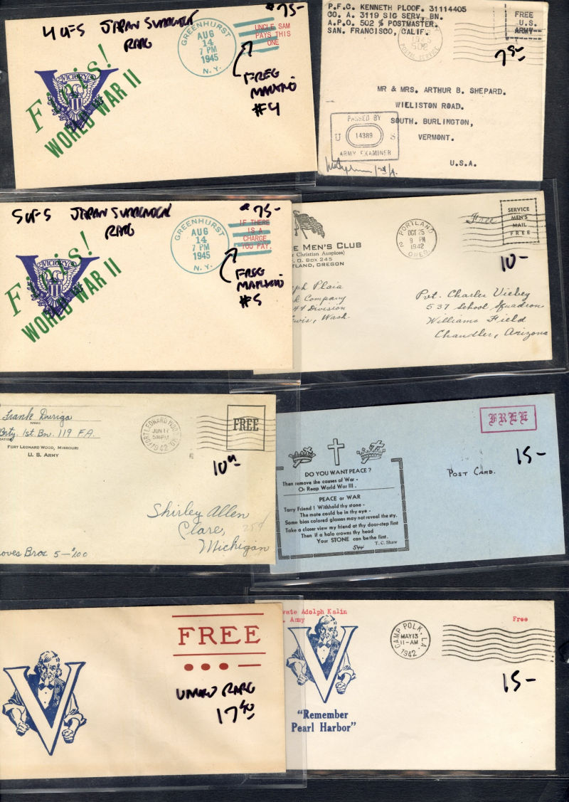 1334 c   imageLARGE LOTS AND COLLECTIONS UNITED STATES - Covers and Postal History 1916-45 WWI and WWII, ca. 100 covers or cards, a nice variety of cachets, censorship markings, YMCA covers, Free-Franks, "Japan Surrenders" cachets, etc.; plus 350+ Patriotic labels, Savings Bonds, Victory, and more, few minor faults, generally fine-v.f., high retail value (Image) (Image 2) (Image 3) (Image 4) (Image 5) (All Images)