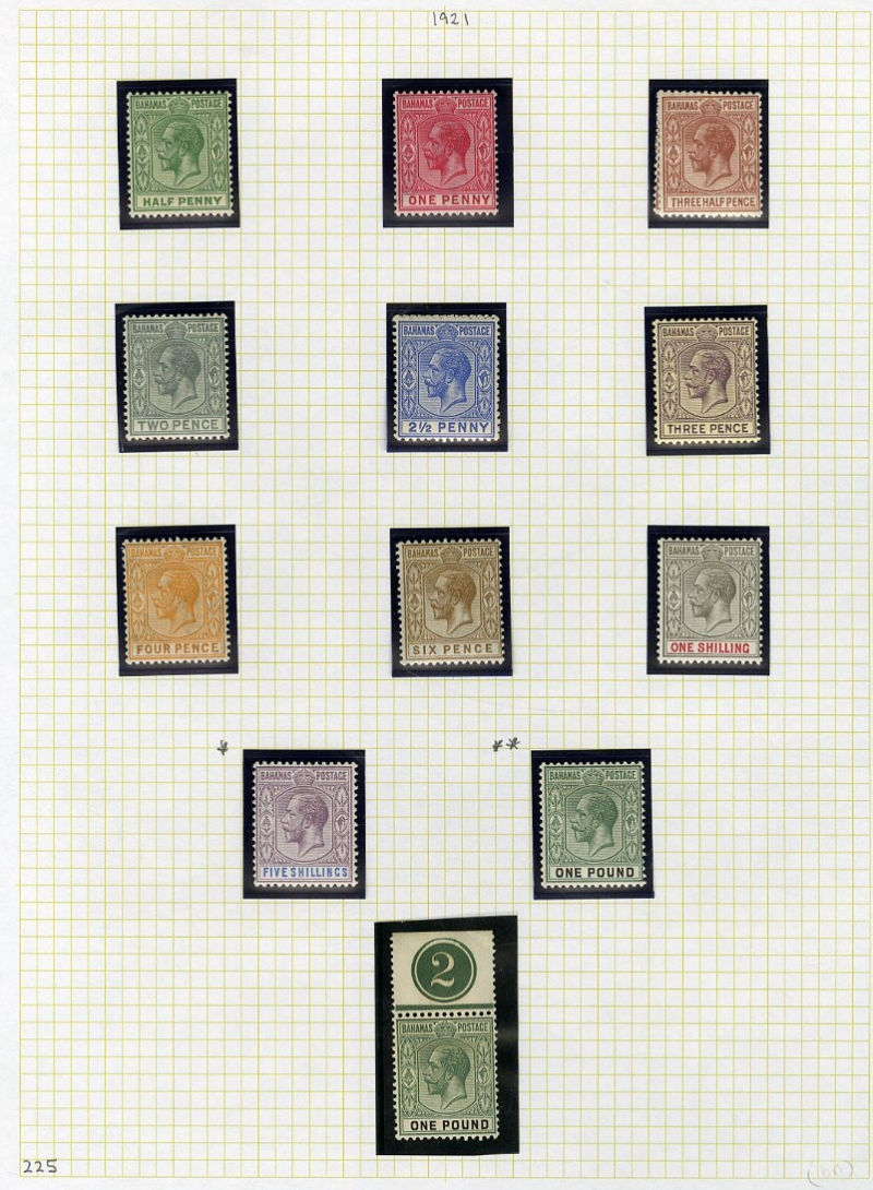1345 og   imageLARGE LOTS AND COLLECTIONS BAHAMAS 1902-21 selection on album pages, with 1902 set to £1, 1911 to 3s, 1912-19 to £1 with shades, 1921 complete, with extra £1 top marginal plate 1 example, fine-v.f., SG £1,210 (Image) (Image 2) (Image 3) (Image 4) (All Images)