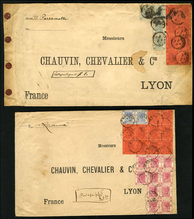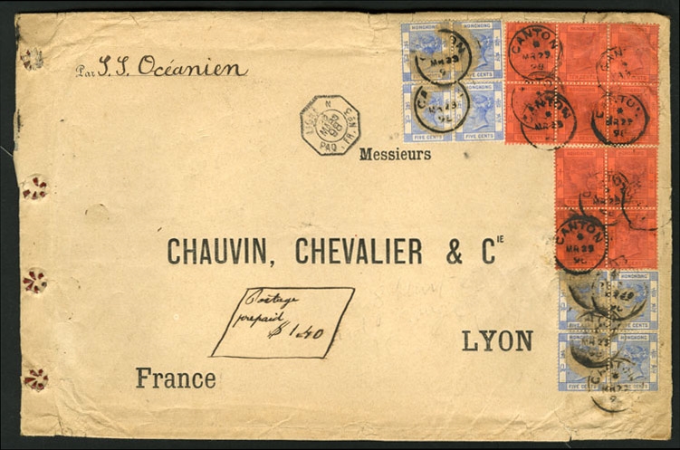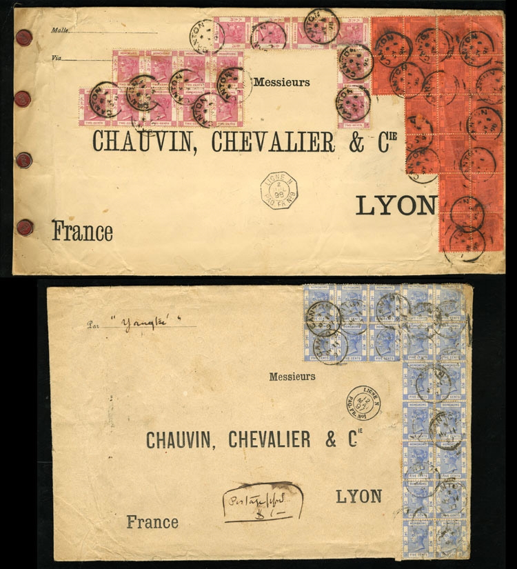 1406 c   imageLARGE LOTS AND COLLECTIONS HONG KONG - Covers and Postal History 1897 Chauvin, Chevalier & Co Correspondence from Canton to France, seven large commercial letters, one used May 11, paying $1.00 with 20x5c Victoria, including a block of fourteen, sent via Hong Kong (May 12), with "Ligne N Paq Fr. No.1" cds on front, also endorsed par "Yangtze,"; another used May 19, paying $1.30 with 10c, 30c and 20x5c Victoria, including blocks of 14 and strips and pairs, sent via Hong Kong, with red "Modane a Paris" entry pmk, par "Cromwell" ship endorsement; another sent on 14 July, paying $1.30 with 10x2c, 2x5c and 10x10c Victoria, including blocks of 10, pairs and strips, par "Ravenna" ship endorsement, others with similar large franking, usual cover wear and some faults, scarce group with seven different ships represented (Image) (Image 2) (Image 3) (Image 4) (All Images)