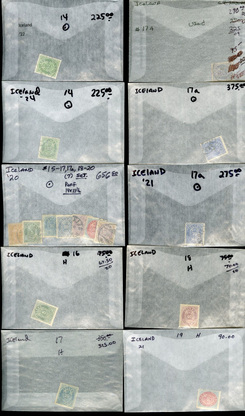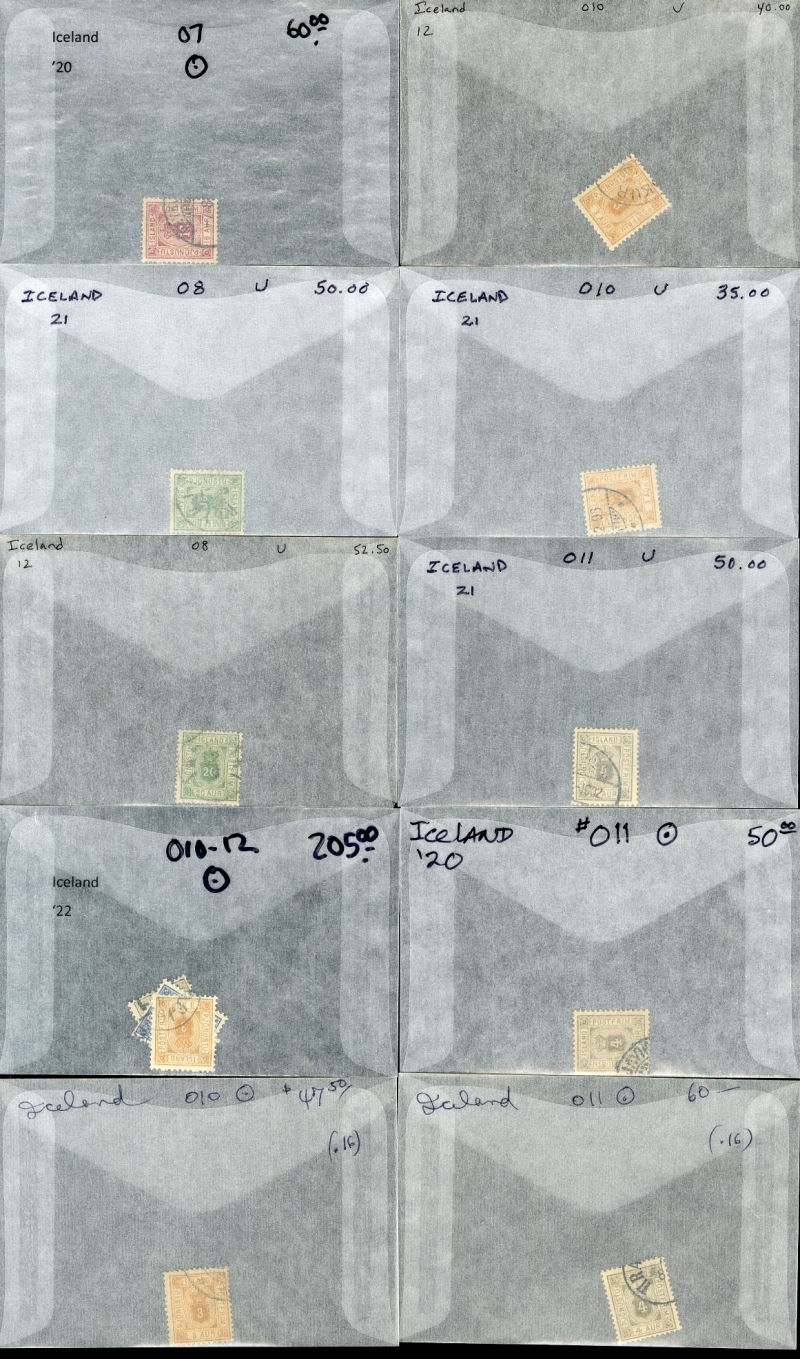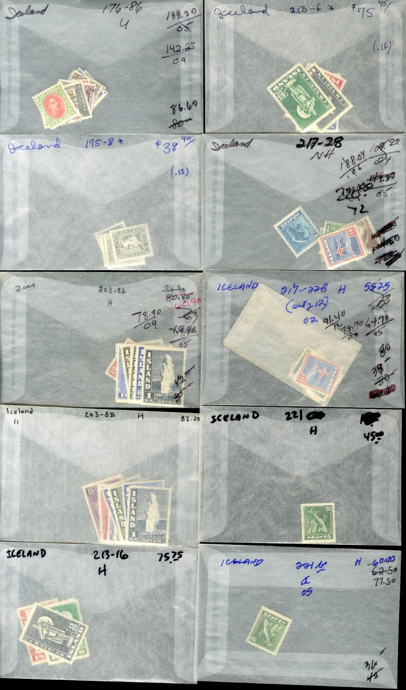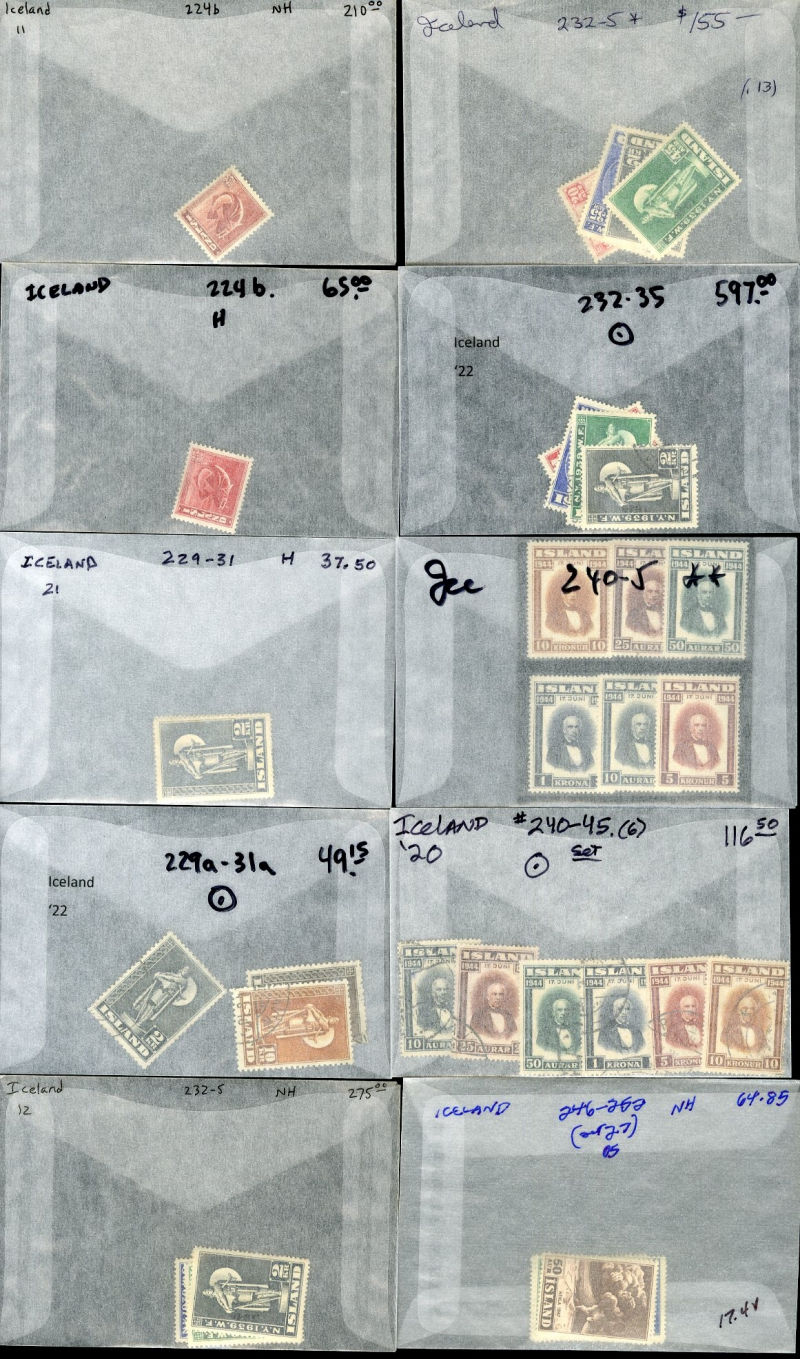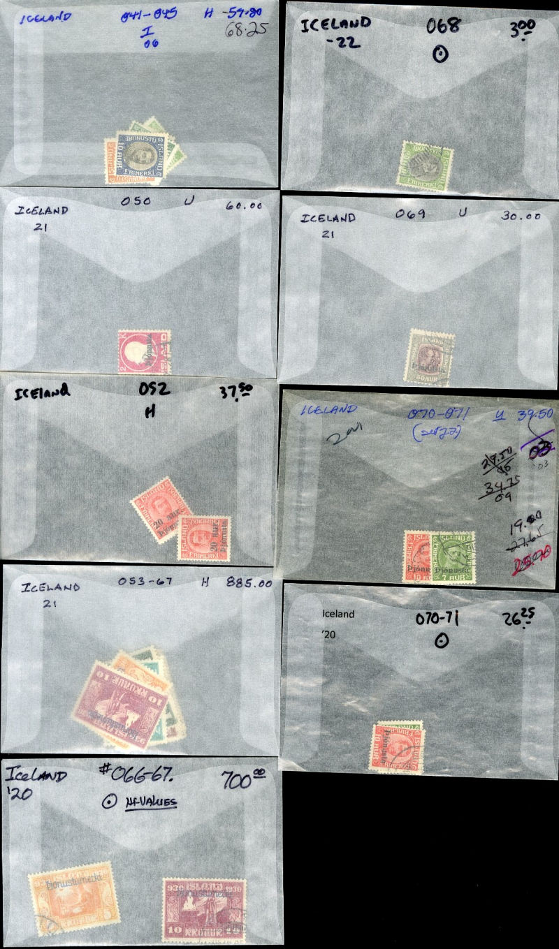 1407 O, og   imageLARGE LOTS AND COLLECTIONS ICELAND (1/296,C1/O71) 1873-1950 dealer's stock in glassine envelopes, 19th and 20th Century, used and unused singles, sets, Regular Issues and Commemoratives, Air Post, Officials, moderate quantities, with abundance of better, high cataloguing items, mixed condition, some usual faults noted, generally fine or better, cat. $35,000+ (Image) (Image 2) (Image 3) (Image 4) (Image 5) (Image 6) (Image 7) (Image 8) (Image 9) (Image 10) (Image 11) (Image 12) (Image 13) (Image 14) (Image 15) (Image 16) (Image 17) (Image 18) (Image 19) (Image 20) (All Images)