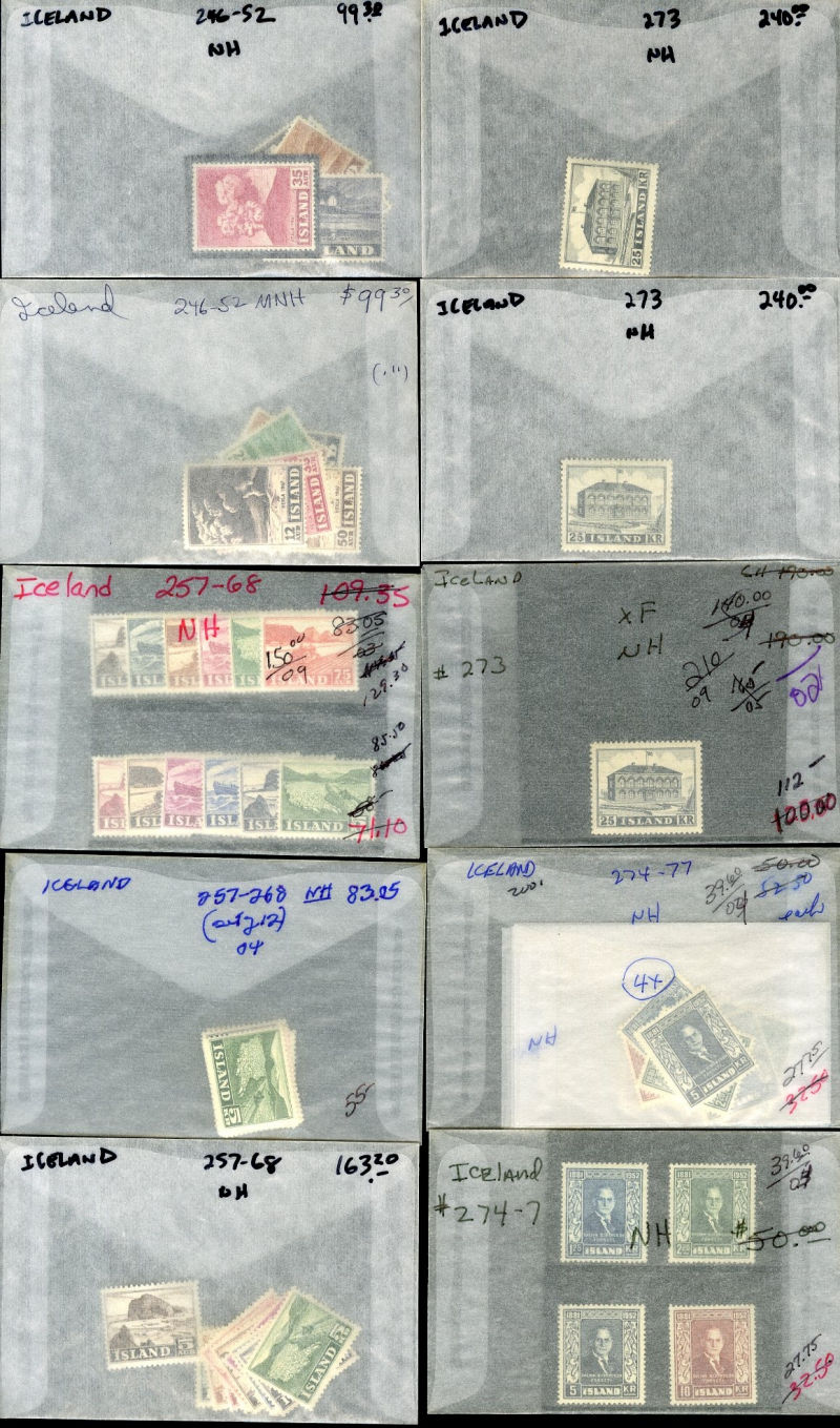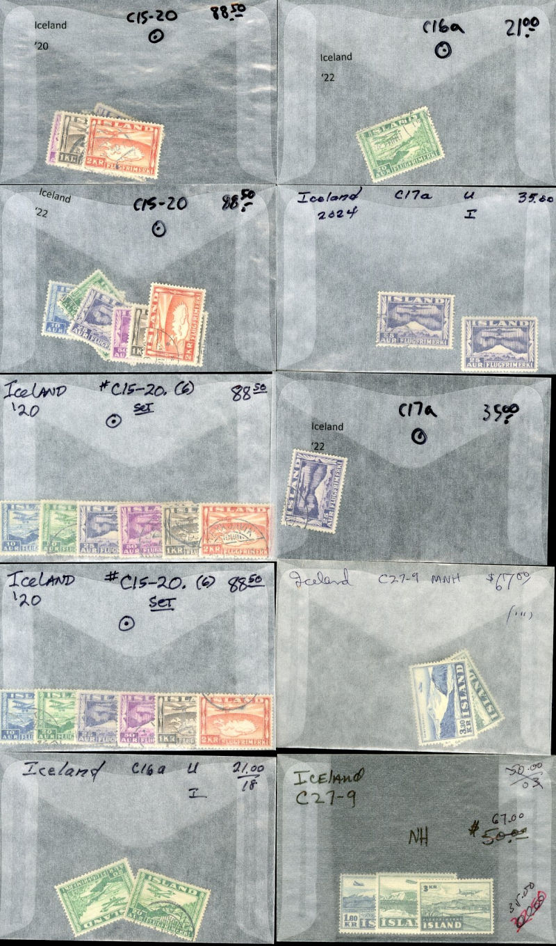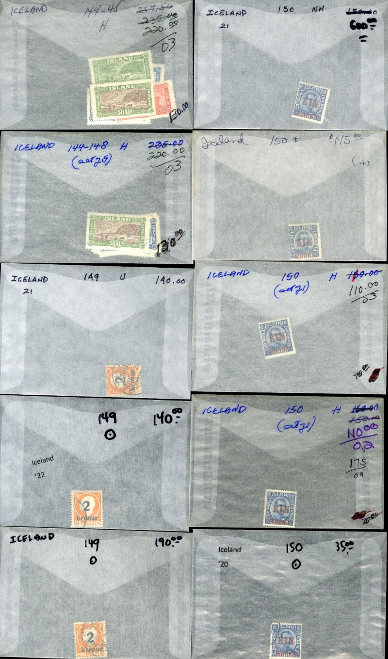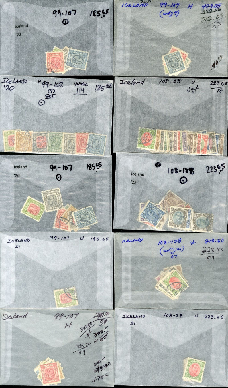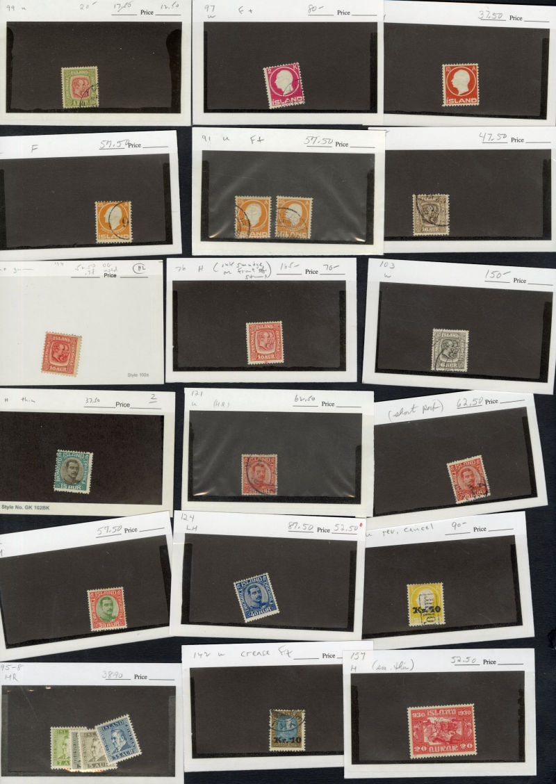 1407 O, og   imageLARGE LOTS AND COLLECTIONS ICELAND (1/296,C1/O71) 1873-1950 dealer's stock in glassine envelopes, 19th and 20th Century, used and unused singles, sets, Regular Issues and Commemoratives, Air Post, Officials, moderate quantities, with abundance of better, high cataloguing items, mixed condition, some usual faults noted, generally fine or better, cat. $35,000+ (Image) (Image 2) (Image 3) (Image 4) (Image 5) (Image 6) (Image 7) (Image 8) (Image 9) (Image 10) (Image 11) (Image 12) (Image 13) (Image 14) (Image 15) (Image 16) (Image 17) (Image 18) (Image 19) (Image 20) (All Images)