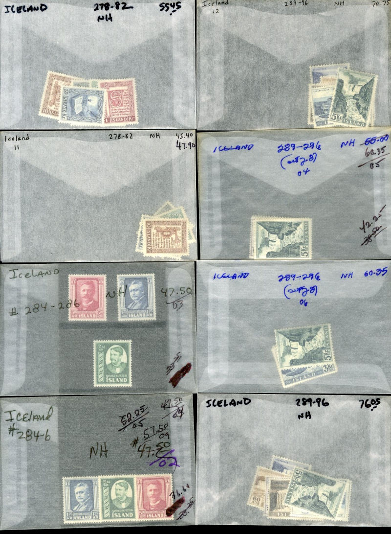 1408 O, og   imageLARGE LOTS AND COLLECTIONS ICELAND 1873-2003 large accumulation of many hundreds of singles and sets in glassines and on small presentation cards, used and unused singles and sets, some early issues (faults noted), later issues with useful items, Air Post, back of book, etc., mixed condition, ex-Mary Farber ("Zillions of Stamps") (Image) (Image 2) (Image 3) (Image 4) (All Images)