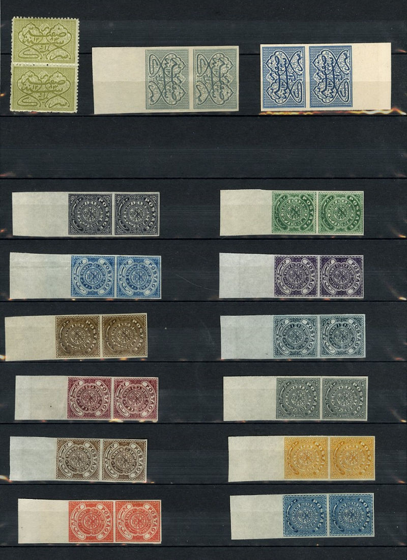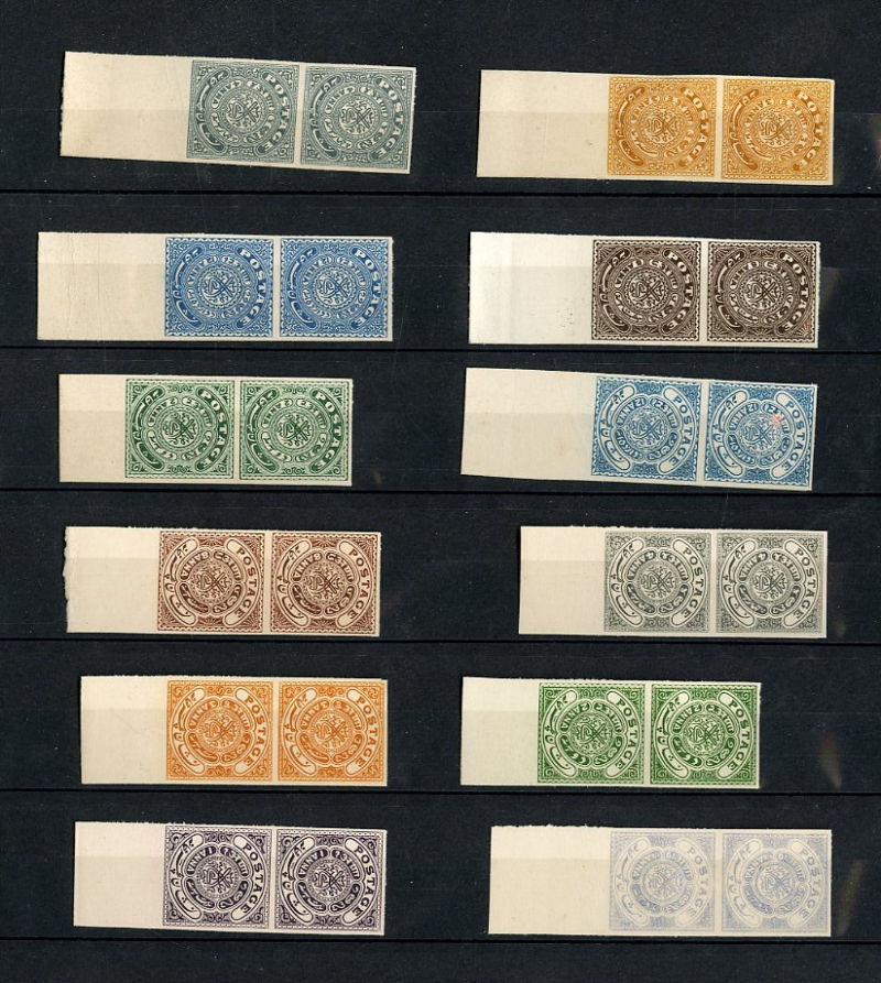 1410 P   imageLARGE LOTS AND COLLECTIONS INDIA - FEUDATORY STATES 1869-1905 selection of 27 trial color proofs, mostly imperforate horizontal pairs, various colors, v.f. and scarce lot (Image) (Image 2) (All Images)