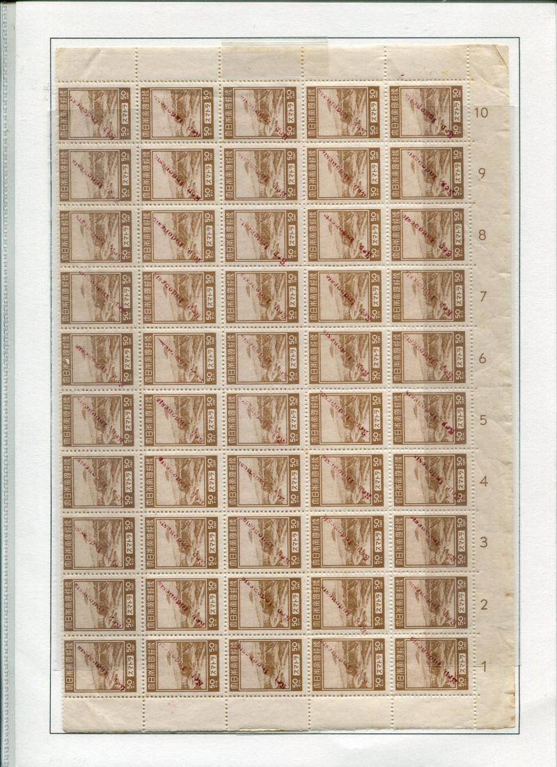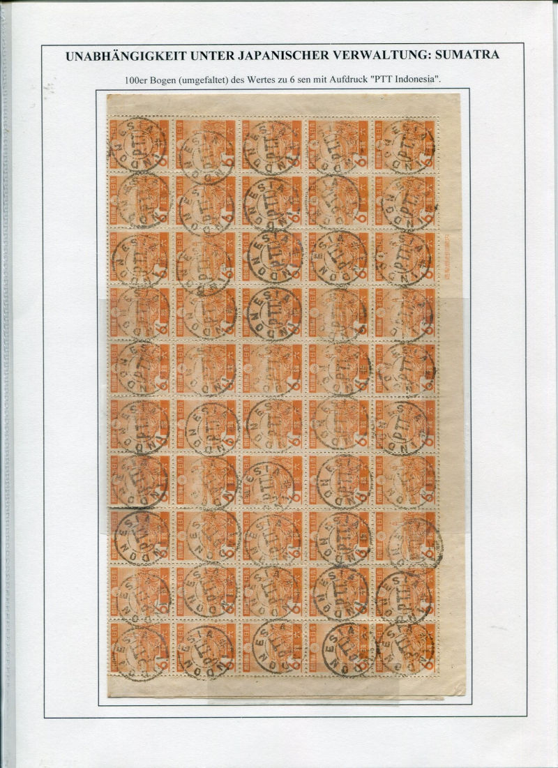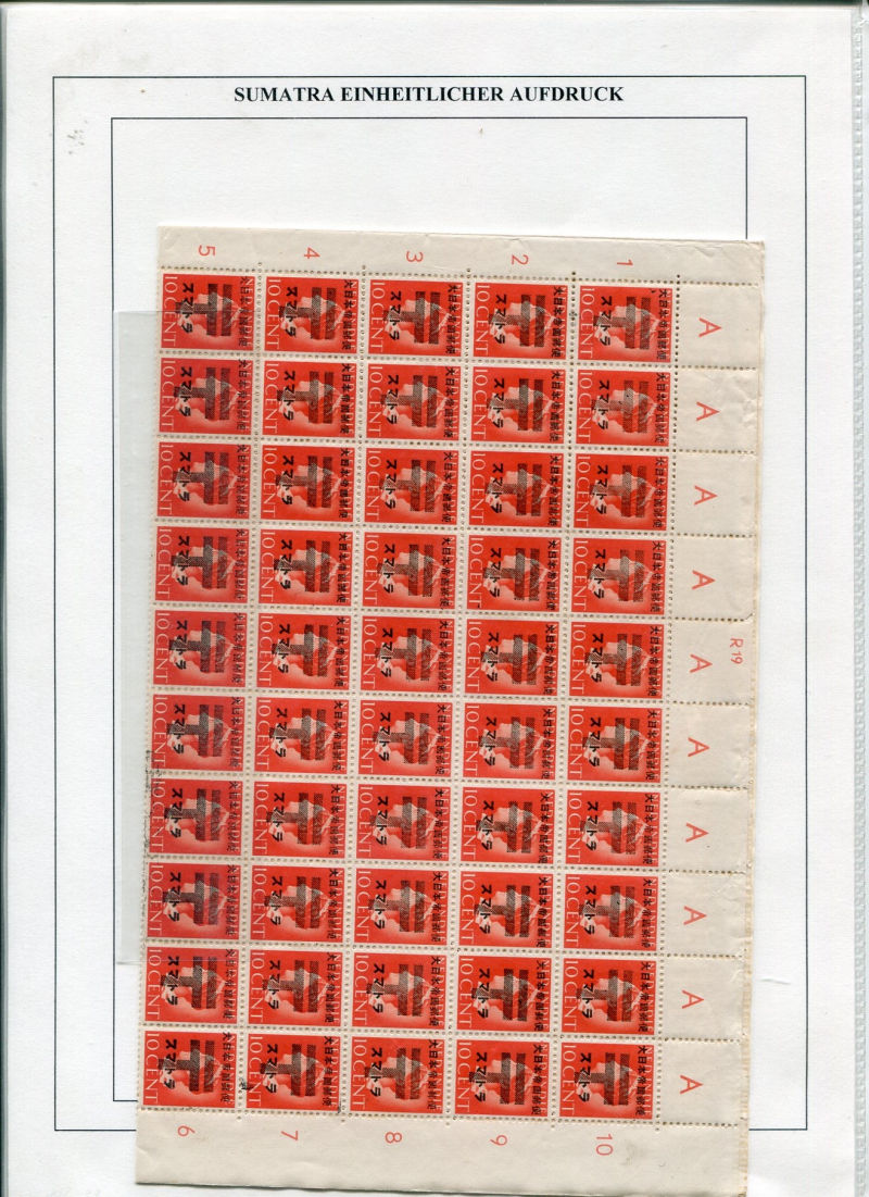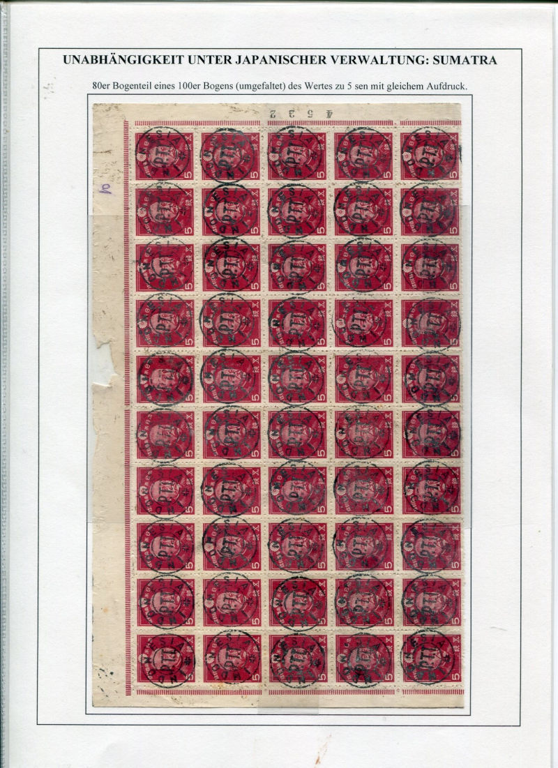 1412 nh, bl   imageLARGE LOTS AND COLLECTIONS INDONESIA Japanese Occupation 1945 sheets and part sheets, five items, including 10c gutter sheet of 200 (folded between stamps), also overprints on stamps of Hong Kong and Japan, fine (Image) (Image 2) (Image 3) (Image 4) (Image 5) (All Images)