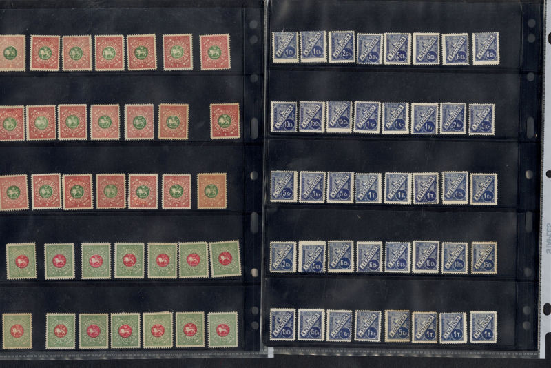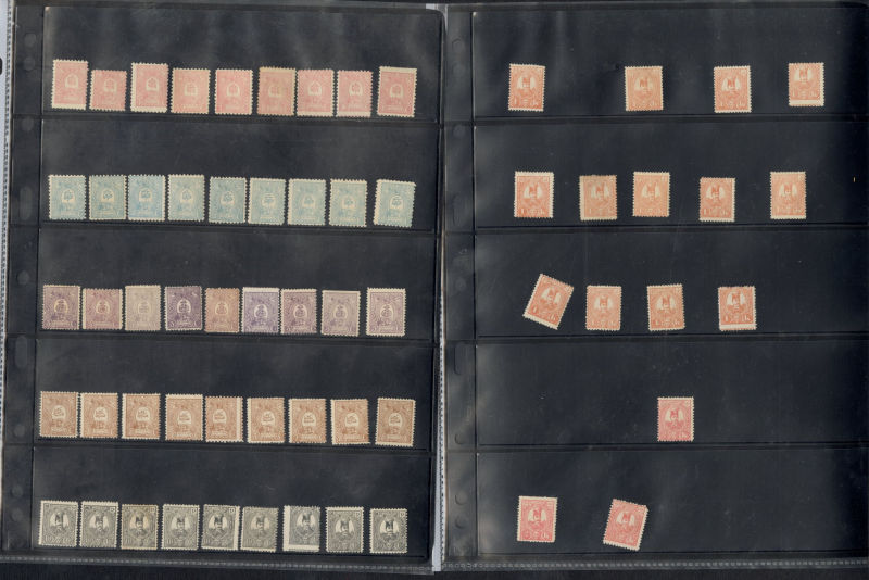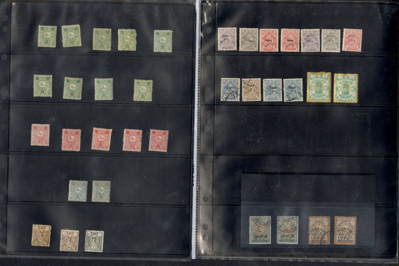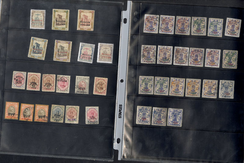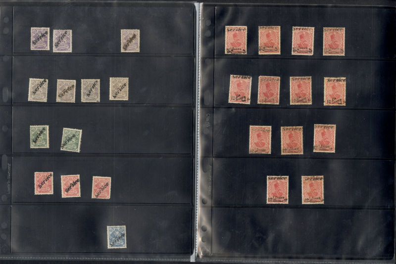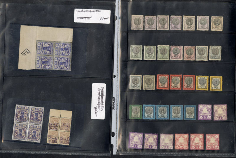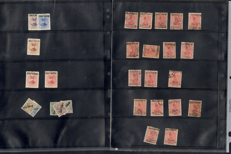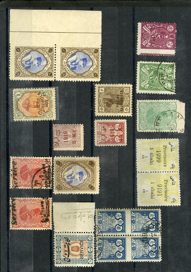 1419 O, og   imageLARGE LOTS AND COLLECTIONS IRAN 1919-35 selection of errors and varieties, including imperf. at sides, Type-setting fault, block of 4x5s 1891 "Mehrabi" imperf. between, canceled to order, used 5kr 1898 variety imperf. at top, pair of 1s 1919 Provisional, overprinted "1999" and "9191" (instead of "1919"), inverted 1922 overprint on 1s 1911 Ahmad Shah issue, two values from the 1919 "Yaghubi" issue (5kr unused and 30kr without, both with inverted overprints), two values from 1902 "Service" with inverted overprints (5s unused and 12s postally used), unused example of inverted "Service" overprint on 10s 1915 Coronation; Reza Shah issues, including pair of 1s 1931 Majlessi issue with the vertical side imperforate, 1s double frame impression, one inverted overprint on 5d 1935 issue, 1s and 6s of 1926 issue, with ink flow misperforated, fine and unusual group, seldom offered (Image)